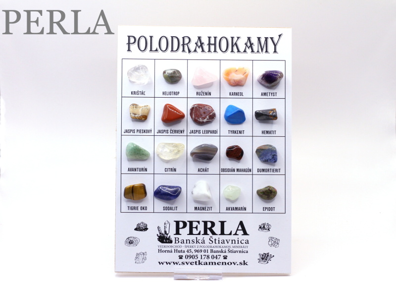 Vzorkovník 20 druhov polodrahokamov, veľkosti cca 1cm s nalepenými tromlovanými kameňmi.