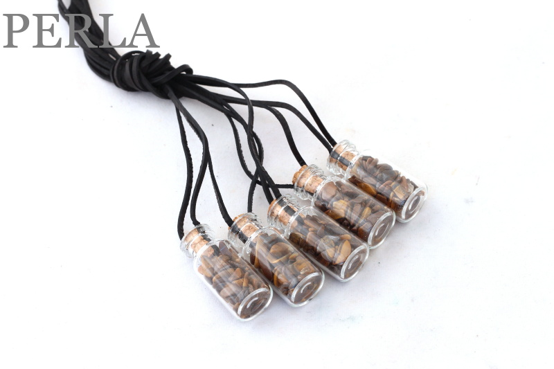 1Kus Flaštička rozmerov 35mm x 15mm je naplnená drobnými trom.kameňmi. Zatvorená je korkovým štoplom a zavesená na koženom remienku 80 cm dlhom a 2mm širokom.