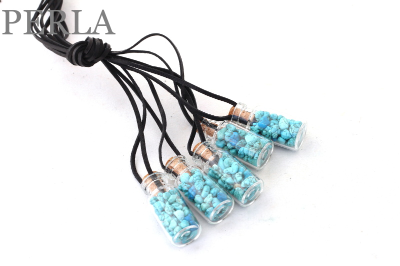 1Kus Flaštička rozmerov 35mm x 15mm je naplnená drobnými trom.kameňmi. Zatvorená je korkovým štoplom a zavesená na koženom remienku 80 cm dlhom a 2mm širokom.