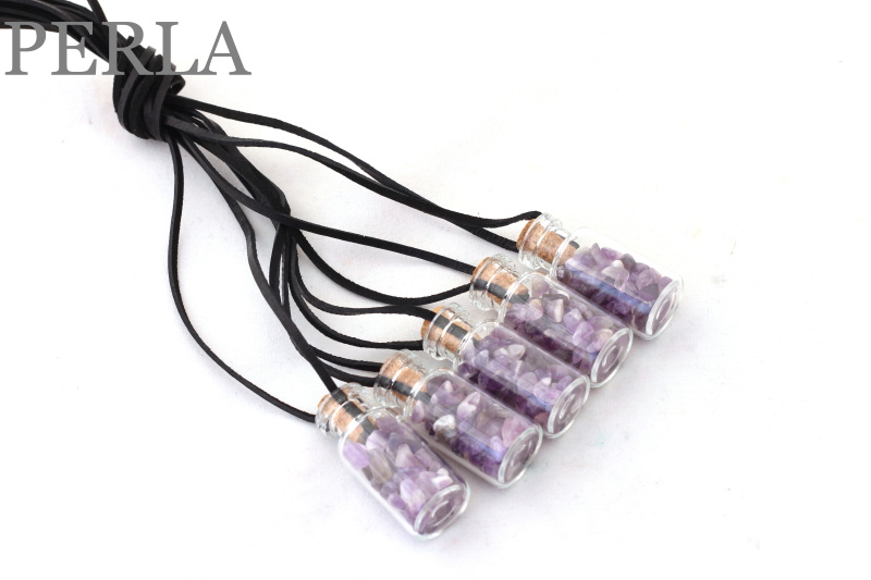 Flaštička rozmerov 35mm x 15mm je naplnená drobnými trom.kameňmi. Zatvorená je korkovým štoplom a zavesená na koženom remienku 80 cm dlhom a 2mm širokom.