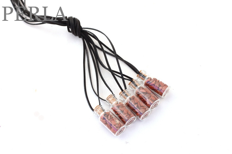 1Kus Flaštička rozmerov 35mm x 15mm je naplnená drobnými trom.kameňmi. Zatvorená je korkovým štoplom a zavesená na koženom remienku 80 cm dlhom a 2mm širokom