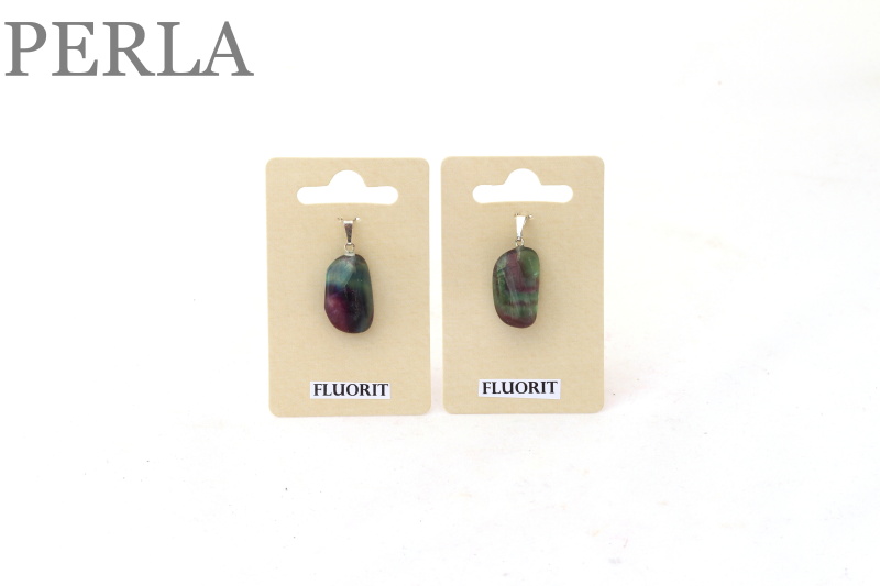 Tromlovaný leštený kameň vel. S cca 2cm, zavesený na výsekovej karte s názvom kameňa. Uchyt - materiál tombak striebornej farby, postriebrený všeobecný kov.