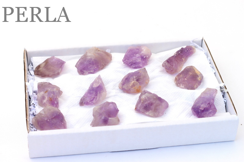 Box - krabička vyrobená z trojvrstvovej lepenky veľkosti 19x12x3cm obsahuje 12 kusov Ametystov, vystlaná papierom v ktorom sú uložené ametysty. . Celý box je zabalený v priesvitnej fólii, ktorá chráni pred poškodením.