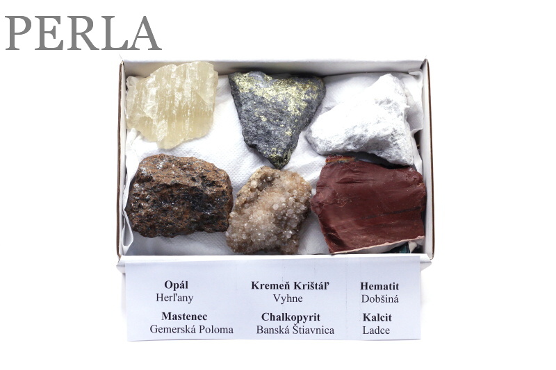 V boxe sa nachádza Opál z Herľán, Kremeň Krištáľ z Vyhní, Hematit z Dobšinej, Mastenec z Gemerskej Polomy, Chalkopyrit z Banskej Štiavnice, Kalcit z obce Ladce.