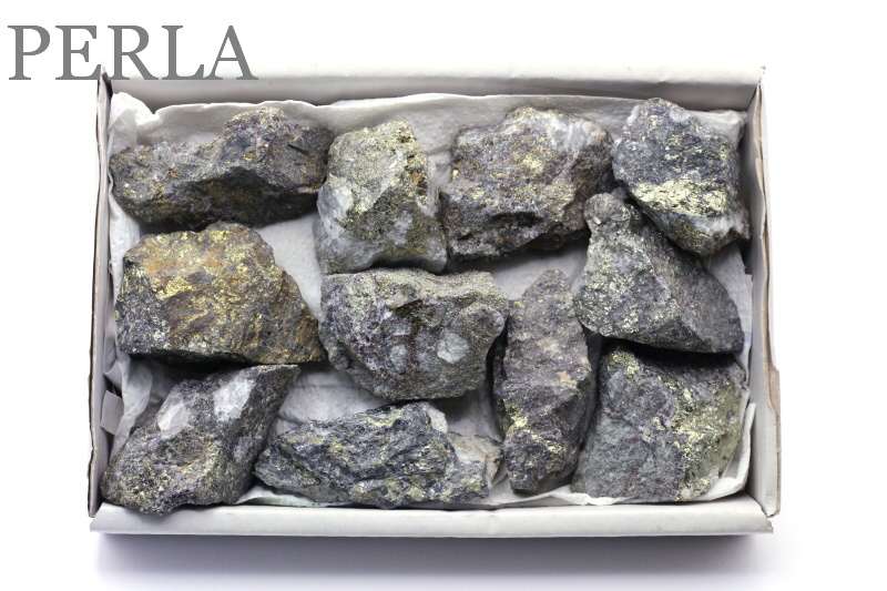 Box - krabička vyrobená z trojvrstvovej lepenky veľkosti 19,5 x 13,5 x 3 cm obsahuje cca 8 - 12 kusov Chalkopyritu v závislosti na veľkosti kameňov.